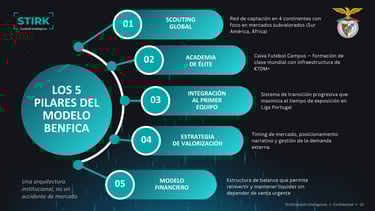 El modelo del SL Benfica no depende de decisiones puntuales, sino de una arquitectura institucional basada en cinco componentes interconectados: